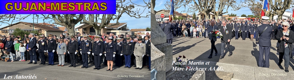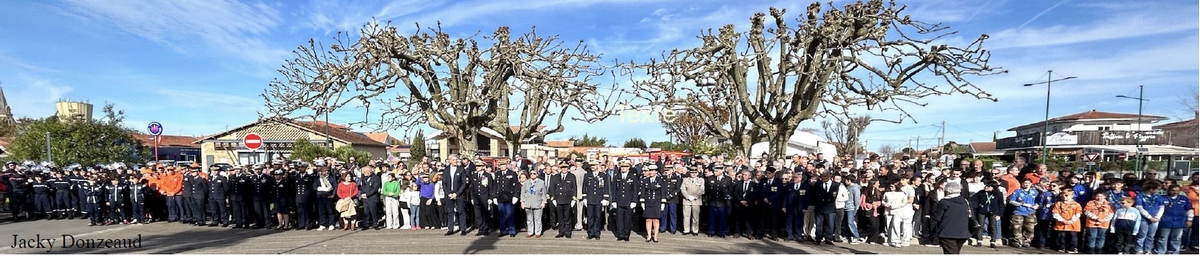 Comme toujours un public nombreux était venu assister à cette commémoration en présence de Monsieur le Sous-Préfet d'Arcachon Jean-Louis Amat, de Madame le maire Marie Hélène Des Esgaulx, du colonel Fabian Kuhlmann commandant la Base Aérienne 120 Cazaux, ainsi que de nombreuses autorités civiles et militaires représentant la gendarmerie, la police nationale et municipale, les pompiers, une délégation militaire de la BA 120, de nombreux porte-drapeaux et diverses associations et de nombreux jeunes : conseil municipal des jeunes, jeunes sapeurs pompiers, scouts du Bassin et la classe de 3ème de défense du collège de Mios.