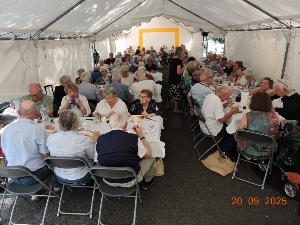 Ce samedi 20 septembre, cent personnes sont venues partager le traditionnel repas de fin d'été sous la tente à l'Amicale. Après le kir à l'apéritif, une entrée très apprécié : avocat et son accompagnement marin préparée par nos gentilles et dévouées épouses. Puis nous avons pu déguster un succulent axoa - riz cuisiné par madame Bonnieu.