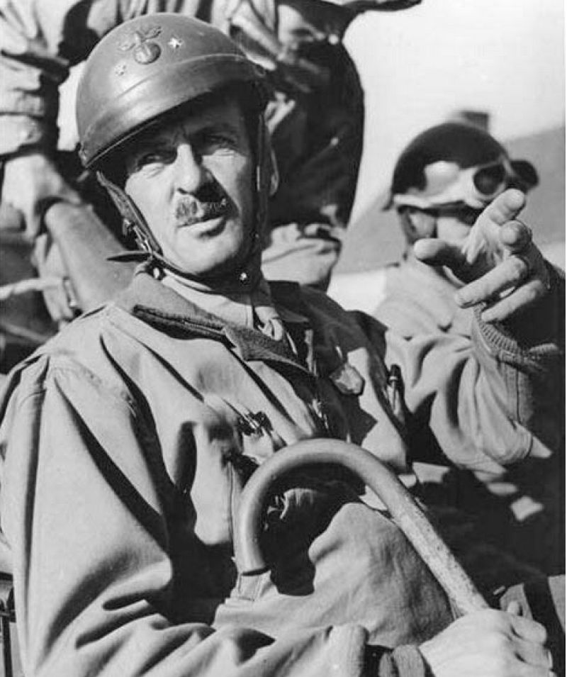 Photo symbole : "Leclerc" en opérations dans sa Jeep, tenant sa canne comme un sceptre, en indiquant la direction : « La victoire, c'est par là ! »